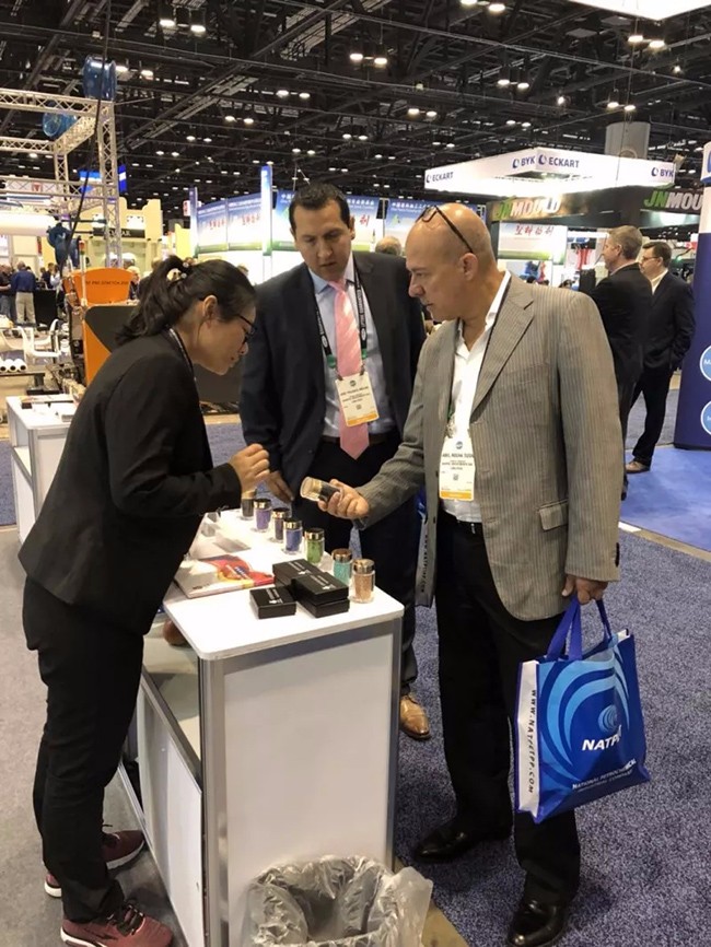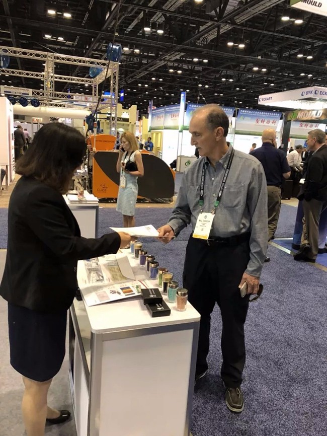 ▲ 紅梅展位上,新、老客戶紛至沓來,紅梅為此次NPE美國塑料展做了精心的準備,不僅有相關(guān)產(chǎn)品的宣傳冊書面資料,同時還有色母粒產(chǎn)品現(xiàn)場展示,讓客戶們能夠全方面的了解紅梅的母料產(chǎn)品。